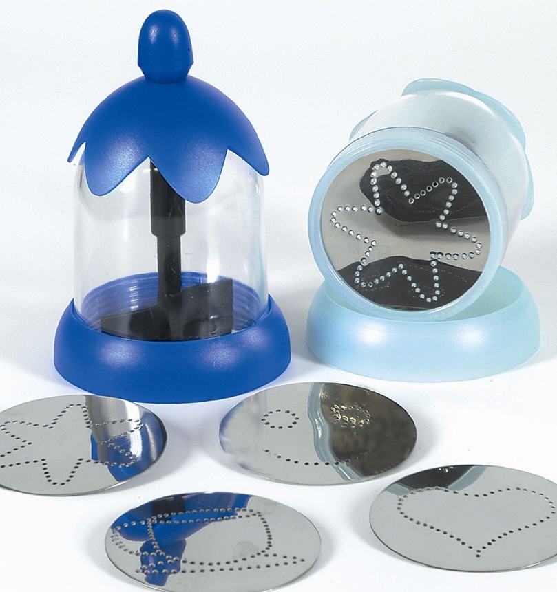 The package contains four patterns with which you can create beautiful motifs quickly and easily. You simply change the lid to the pattern you want. Can also be used to decorate cakes, cakes, etc.