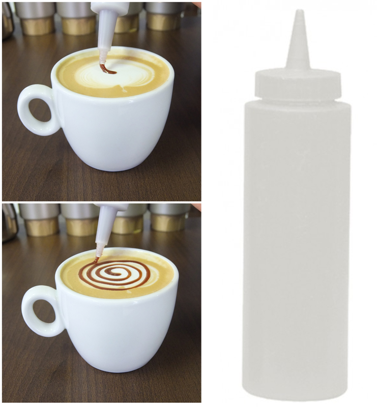 These bottles help you to draw fancy patterns in chocolate or vanilla. Keep them at your barista station, right next to your espresso machine. These bottles can also be used to do elegant platings of pastry with other thick syrups (caramel, butterscotch, raspberry, etc.). Use them to create a visual synergy between your dessert platings and your latte.